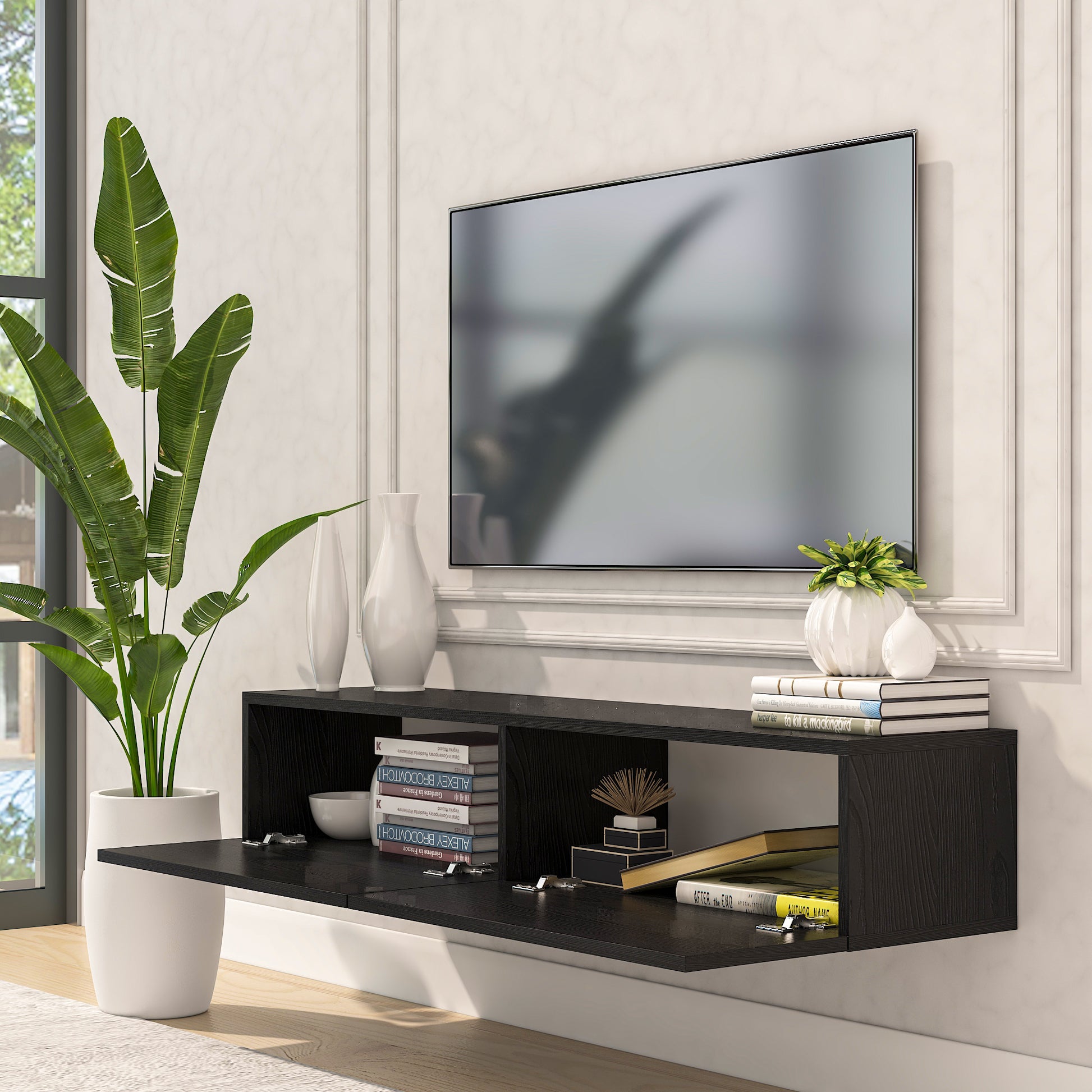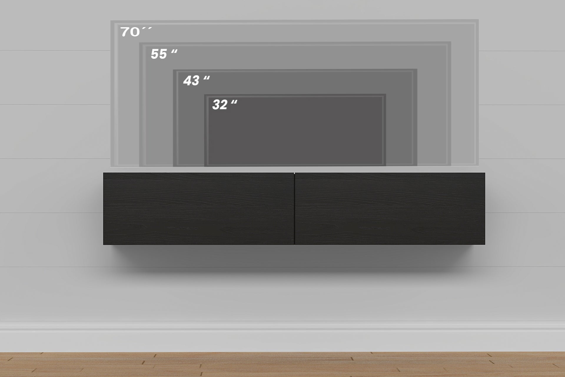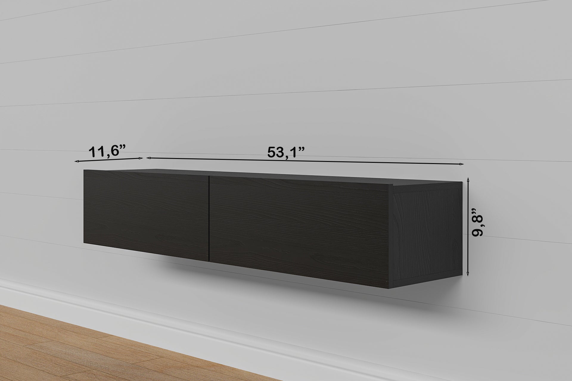 The Housley 53" Floating TV Stand combines sophisticated minimalist design with practical functionality, making it an ideal choice for modern living spaces. This wall-mounted console accommodates TVs up to 70 inches while its compact 12.5" depth maximizes floor space, perfect for contemporary and narrow rooms. Two spacious 26.5" cabinets provide organized storage for media, gaming consoles, electronics, and decorative items, while the open area beneath invites creative styling with baskets or additional furnishings. The floating design creates visual lightness and allows flexible use of your floor space, delivering both aesthetic appeal and intelligent storage solutions for the discerning homeowner.