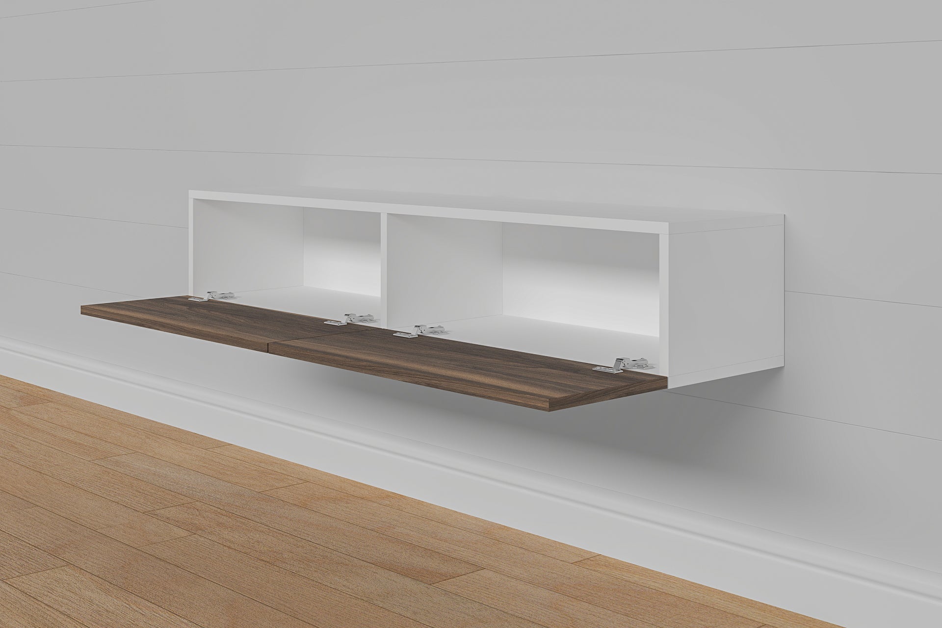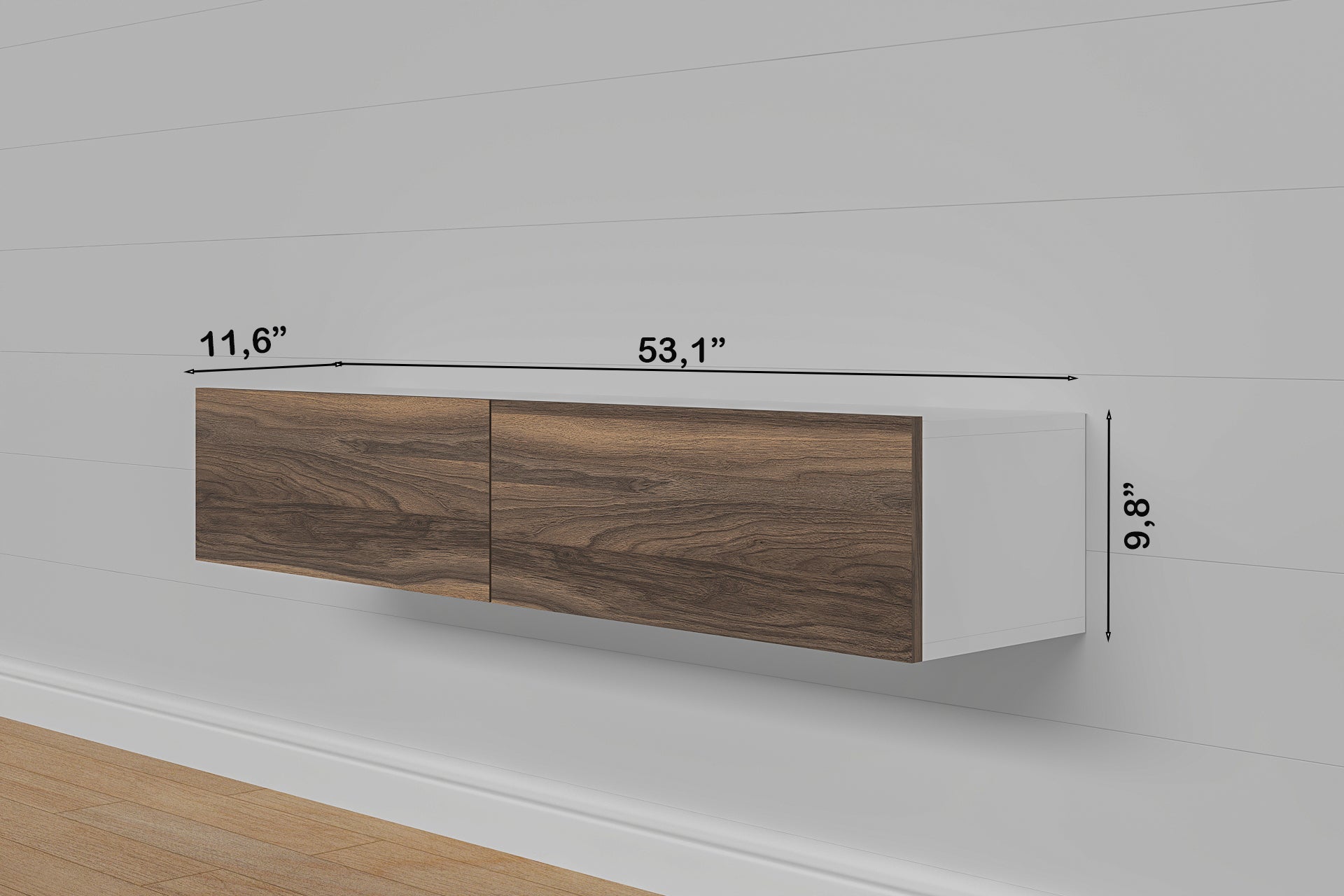 The Housley 53" Floating TV Stand combines sophisticated minimalist design with practical functionality, making it an ideal choice for modern living spaces. This wall-mounted console accommodates TVs up to 70 inches while its compact 12.5" depth maximizes floor space, perfect for contemporary and narrow rooms. Two spacious 26.5" cabinets provide organized storage for media, gaming consoles, electronics, and decorative items, while the open area beneath invites creative styling with baskets or additional furnishings. The floating design creates visual lightness and allows flexible use of your floor space, delivering both aesthetic appeal and intelligent storage solutions for the discerning homeowner.